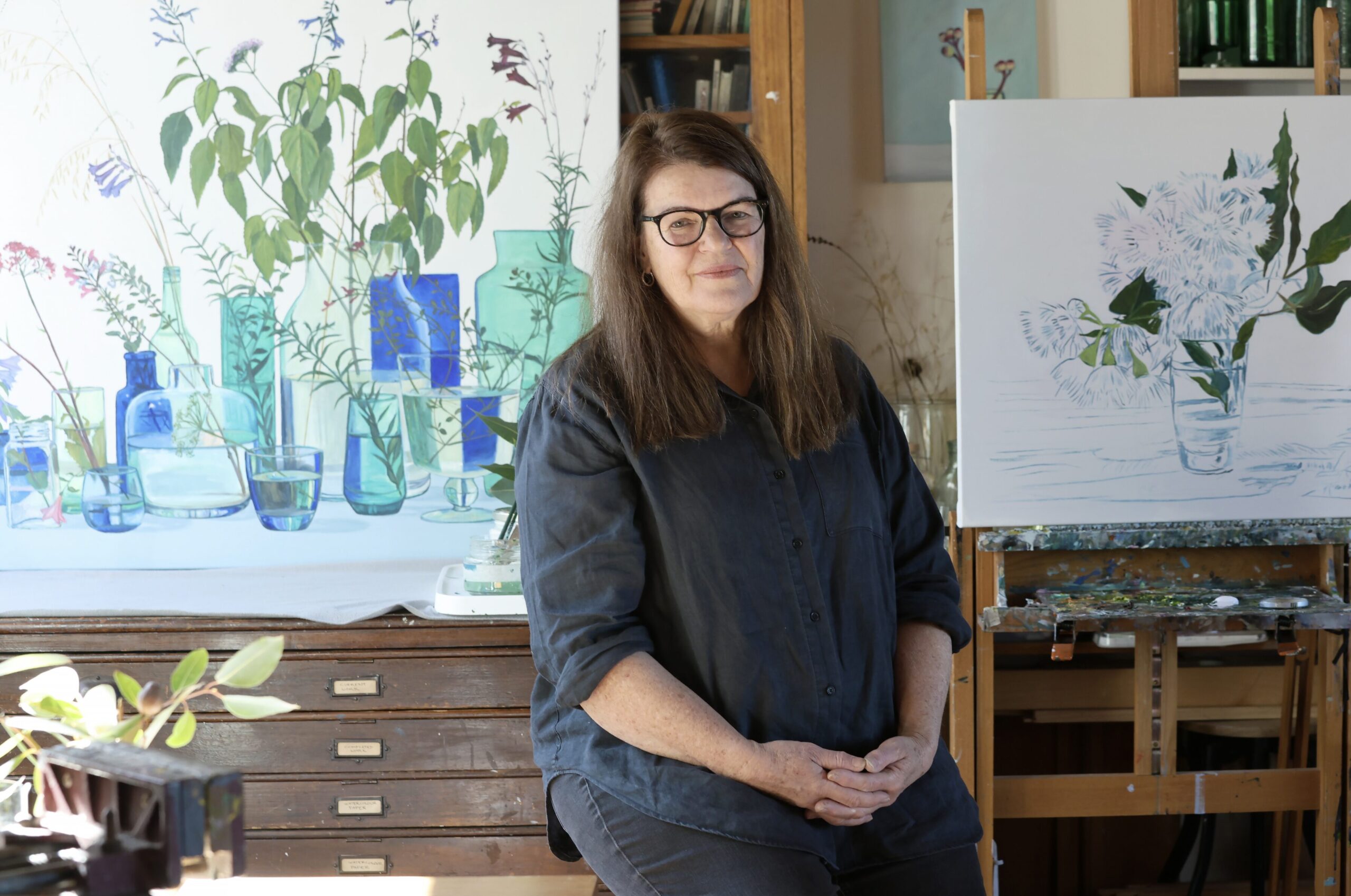 My recent still-life paintings combine a love of the untamed and wild nature of flowers, grasses and tree foliage. I combine this plant life with my collection of glassware. The glassware includes everything from fine crystal vases to utilitarian jars.