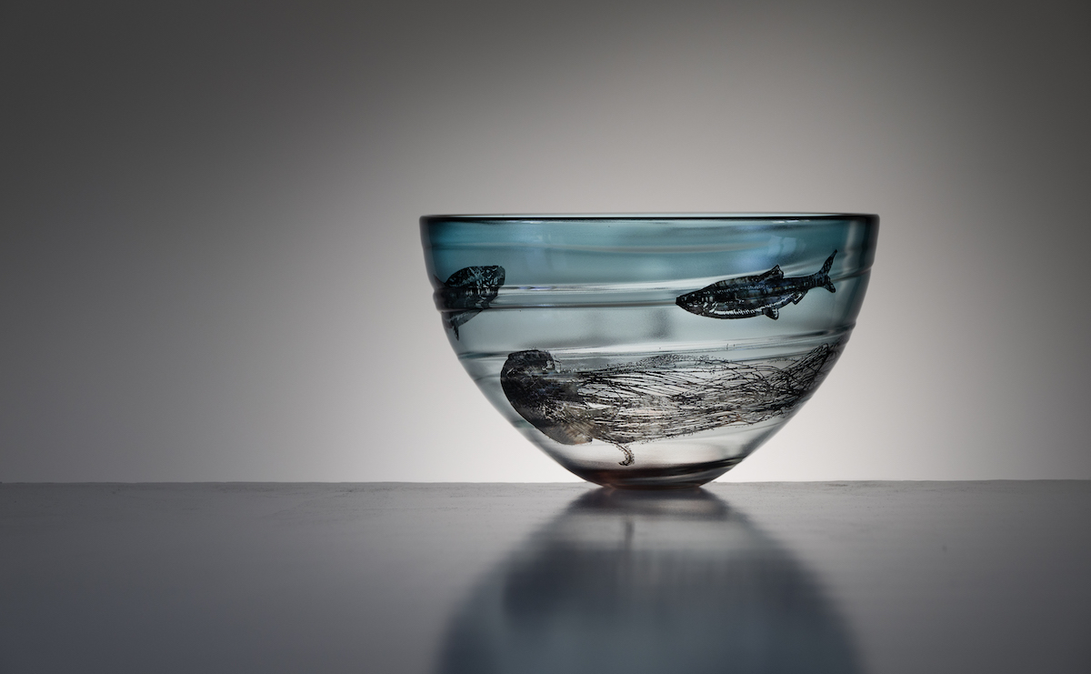 blown glass fire polished with gold lustre surfaces and sandblasted imagery