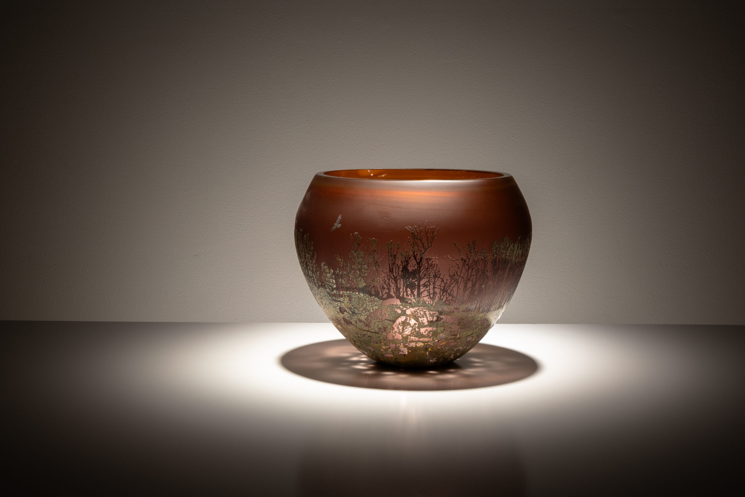 blown glass with glass powder, metal leaf surfaces and sandblasted landscape imagery